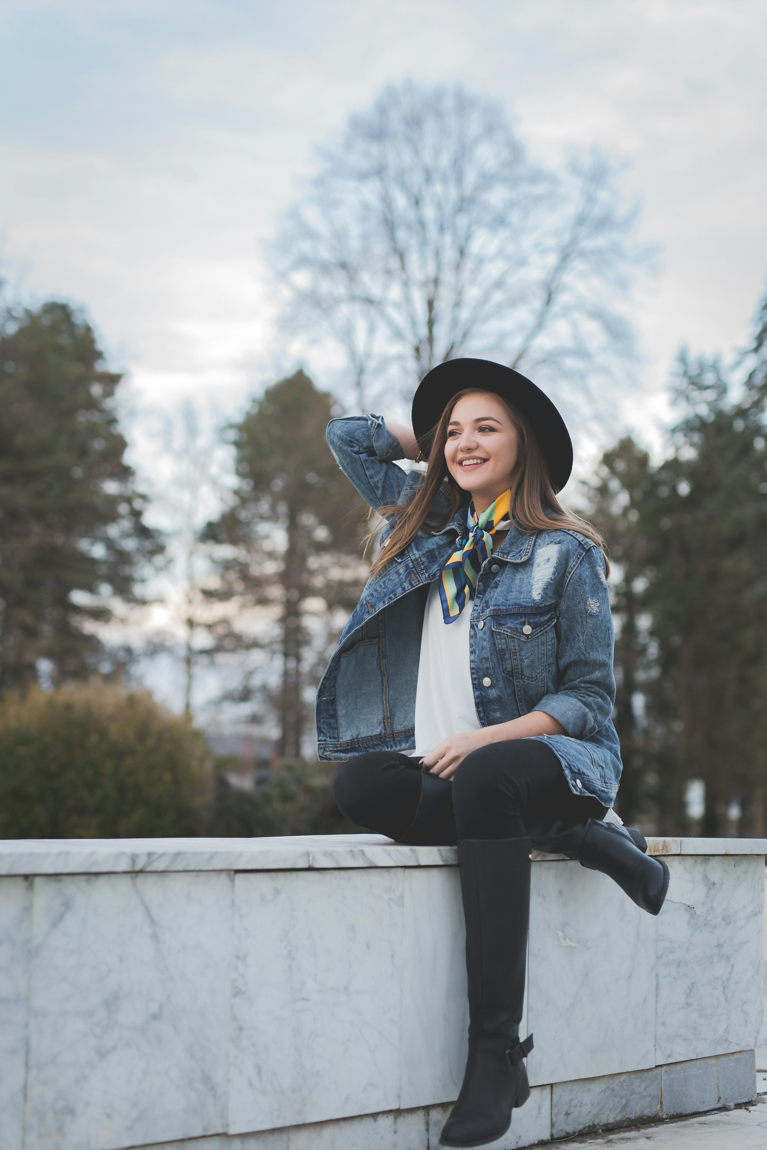 A Girl Is Sitting On A Bench And Is Wearing A Denim Jacket