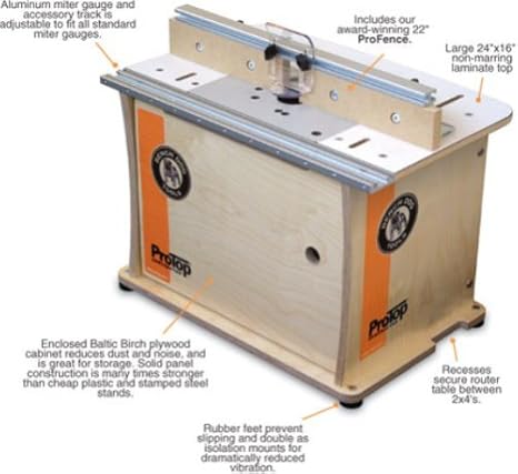 The bench dog 40 001 protop contractor benchtop router table comes with all major parts included and one only needs to put together the tabletop fence and base plate. It includes a non marring laminate top bench dogs 22 profence with integral 2 12 dust port an aluminum miter accessory track that adjusts for a no slop fit for standard miter gauges a pre drilled router insert plate that fits many popular routers and an enclosed birch plywood cabinet that minimizes dust and noise.