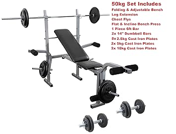 Uk Fitness Weight Training Bench Set Multi Gym With Leg Extension 6ft Barbell Dumbbells 50kg Cast Iron Weight Plates Complete Weight Lifting Set
